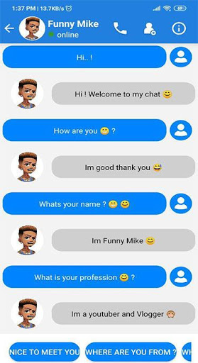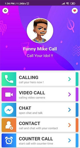 You need to call your idol FunnyMike , we are here today to give you this application that allows to you have a very funny time by being with FunnyMike in a fake call, are you ready to simulate a FunnyMike fake call, yes you can prank your friend and tell them that you have an incoming call from funnymike , and have fun together, and they also can install this app and having a simulation of an incoming call from FunnyMike app.With FunnyMike games Call you can get a fake call in anytime, and anywhere, just open the funnymike app Fake Call app, and start to call or chat with FunnyMike wallpaper Call Fake, and also have a video call with FunnyMike call Wallpaper, install it now and start having cool time with you hero FunnyMike real call Games.FunnyMike prank call Call, Today you can prank your friends and joke with them, Connect to funnymike video call fake Call by clicking on the fake chat button and have fun with your friends.Today, FunnyMike phone call call is coming with many features, like you can simulate a fake call with the famous person that you like and your idol, so here in FunnyMike fake call, and also you have a fake chat with him, and also receiving a cool video call from FunnyMike , and there is also a contact section when you can also contact by fake calling other famous personalities, they are related to FunnyMike .