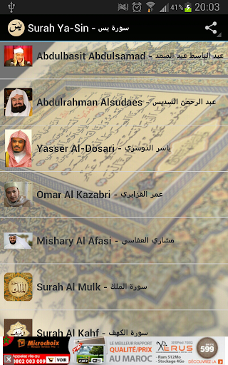 This application offers multiple readings of Surah Al Yasin by the angelic voices: Abdulbasit Abdulsamad, Omar Al Kazabri, Mishary Al Afasi, Abdulrahman Alsudaes, Saud Al-Shuraim and Yasser Al-Dosari.