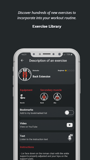 Search, Filter by muscle group or equipment, Listen to instructions or watch video.