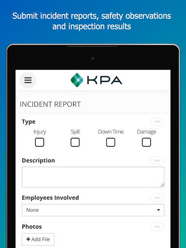 KPA EHS is a powerful yet flexible safety management app for reporting, training, alerts, tasks, inspections and more. Strategically improve safety, regulatory compliance and productivity.