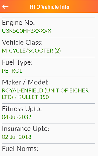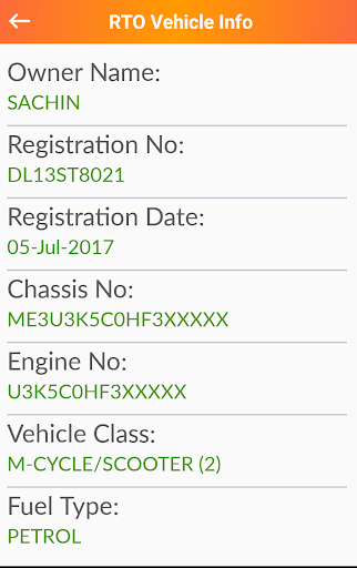 # App Will give you the underneath vehicle registration details by giving vehicle number in this RTO Vehicle Information app Owner Name, Address, Age, Vehicle Registration Date, Vehicle Registration City, Type, Model, City, State.