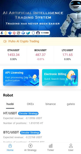 iYuho is an online robot that automates its operations of buying and selling of Bitcoin and other cryptocurrencies in up to 4 exchanges at the same time, Binance, Huobi, Okex and Gate.io. One of the great advantages that the robot offers is that it works 100% in your mobile app, so you do not have to leave the application open for it to do the operations.