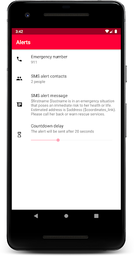 • Emergency alert feature to send SMS in one click (with your estimated location).