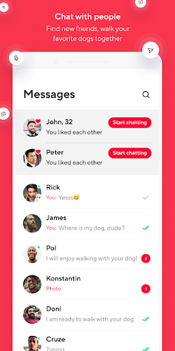 🐕 Rexi will show you nearest dog lovers. "Like" or "pass" on each dog lover you see. After you press like they'll be notified directly. If there's mutual interest, you'll be matched so you can begin chatting about all things puppies.