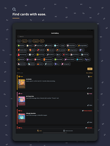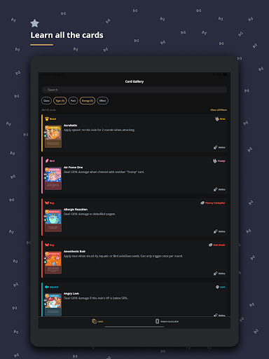 • Explore all the Axie cards using our filters. Filter cards by class, type, part, energy cost, and effect. Look in advance, what your enemy's cards are gonna use.