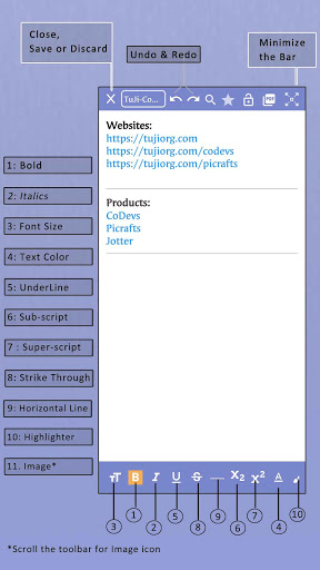Jotter is a Rich Text Editor Android application. Rich Text Editor allows to type text/notes and style it. Jotter helps you to write and save your notes, thoughts, ideas or you can maintain a whole diary. And share them by converting in PDF and other formats.