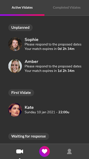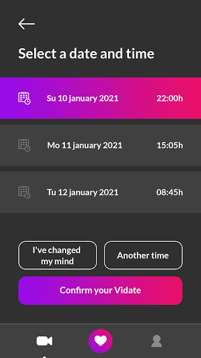4. Vidate! Skip the texting, start directly with video dating. Your first Vidate lasts 5 minutes. Both in for another Vidate? Plan your second Vidate. This one lasts 30 minutes! Nice match? Time to unlock each other's phone numbers and go on a real date! We leave it to you guys and let Cupid do the work!