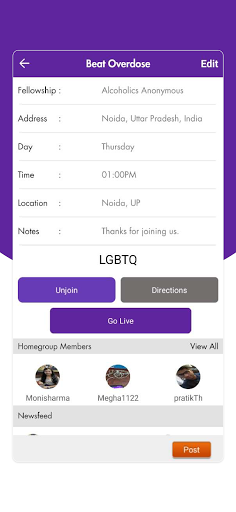 - Meetings – Add your homegroup, join your home group, get directions to meetings, stream your homegroup live, chat with your homegroup members, star an In APP meeting