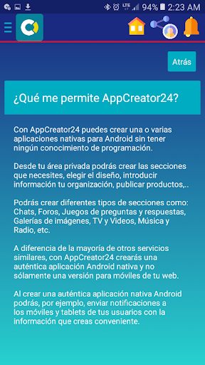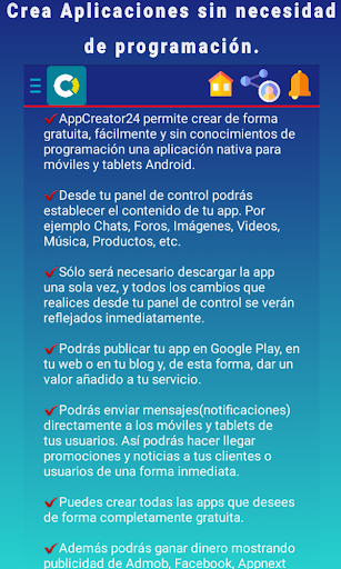 AppCreator24 Ia membolehkan anda membuat percuma, mudah dan tanpa pengetahuan tentang pengaturcaraan aplikasi asli untuk Android mudah alih dan tablet.