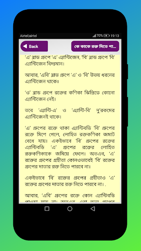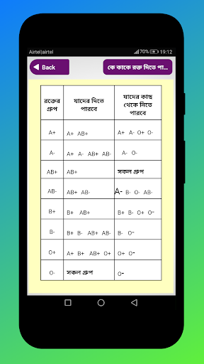 রক্তের গ্রুপ Blood Group সম্পর্কে আমাদের অনেক কিছুই অজানা। রক্তের গ্রুপ নির্ণয় (blood group test) কিভাবে করে সেটা জানার আগে আমাদের জানা প্রয়োজন রক্ত কি বা রক্ত কাকে বলে।Bangla Blood group app will help you find all the details of rokter group, ke kake rokto dite parbe, ke kar kas theke rokto nite nite parbe. Kon rokto newa jabe and kon rokto newa jabena ei sokol tottho. This is a bangla health and medical related application to educate you about rokto.