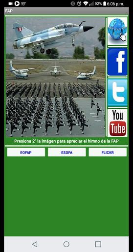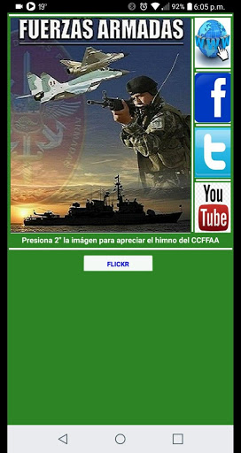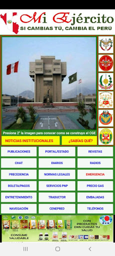 "My Army" เป็นแอปพลิเคชั่นที่สร้างขึ้นเพื่อแจ้งให้ทราบเกี่ยวกับกิจกรรมสาธารณะที่ดำเนินการโดยหน่วยงานสาธารณะต่างๆของรัฐเปรู กองทัพของฉันมีลิงก์ไปยังเว็บเพจทั้งสองและเครือข่ายโซเชียลอย่างเป็นทางการได้อย่างง่ายดายและรวดเร็วจากแต่ละคน (Facebook, Twiter, YouTube และอื่น ๆ ) | คลิกที่ภาพของหน้าจอหลักของ แอปพลิเคชั่นนี้นำเราไปสู่วิดีโอที่ให้รายละเอียดในอดีตเกี่ยวกับการก่อสร้างสำนักงานใหญ่ของกองทัพบกและหน้าจอหลักของแต่ละสถาบัน FFAA ไปยังเพลงของสถาบัน