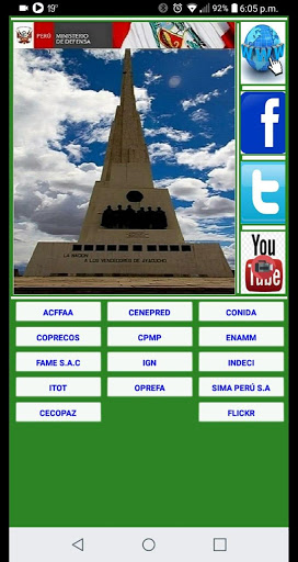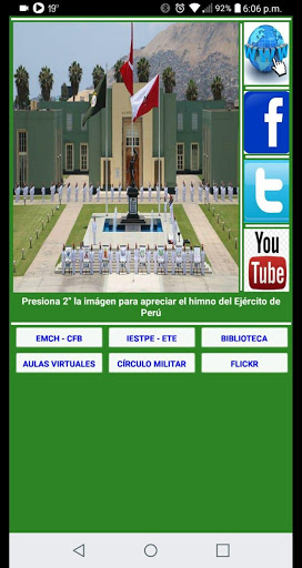 ในที่สุดในกองทัพของฉันเราได้รับการพิจารณาลิงก์ที่นำเราไปสู่เว็บและเครือข่ายสังคมออนไลน์ ของผู้อื่นการพึ่งพารัฐเปรูและที่เกี่ยวข้องกับแต่ละสถาบันหรือการพึ่งพา FFAA (ห้องสมุดทั่วไปของกองทัพห้องเรียนเสมือนจริง, Emch, Iestpe-ETE, ICTE, IGN, ฯลฯ ) ในขณะที่เรากำลังเขียนแสดงความคิดเห็นและการมีส่วนร่วมของพวกเขาเราจะปรับปรุงแอปพลิเคชันนี้เพื่อให้มีประโยชน์มากขึ้นสำหรับคุณ