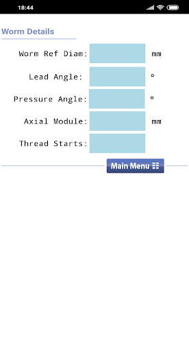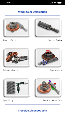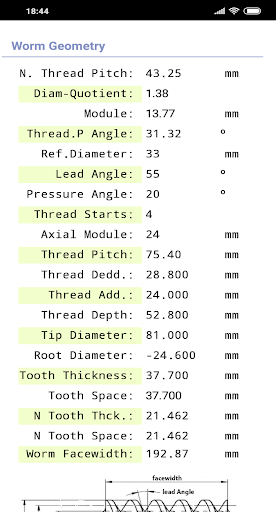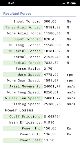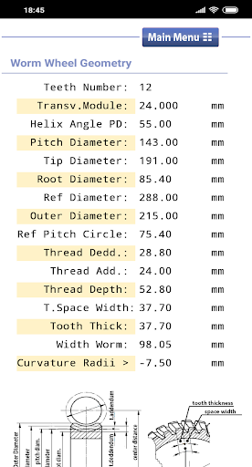 Application to calculate the dimensions of a Worm Gear set. Need to know the center distance and ratio to start the calculation. It will help you to define the worm dimension giving to you soem reccomended values. Torque, speed and power is defined to caclulate the reaction forces.