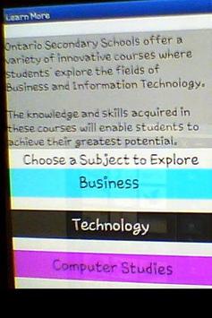 This application is an excellent way to explore the innovative Business, Computer Science, and Technology courses in Ontario high schools. The application includes information about each course along with extra information such as business competitions and an interactive game. The game involves identifying common Myths about Computer Science. Explore and enjoy. Updates to follow.