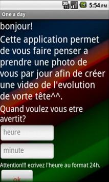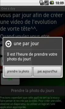 Vous avez certainement vue ces videos de personnes qui se prennent chaque jour en photo et qui au bout d'un temp crées une video impressionante grace à la sucsession de ces dernières. Alors une par jours est faite pour vous, cette application permet de vous faire penser au moment ou vous devez prendre votre photo et vous propose d'ouvrir l'appareil photo. De plus une alert vocal vous l'indique! Le moment de l'avertissement est parametrable en selectionant tout simplement l'heure exacte a laquel vous voulez vous y faire penser. De plus une alert vocal vous l'indique!