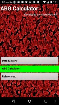 The ABG Calculator aids medical professionals and students to interpret the results of arterial and venous blood gas samples. The clinician has the ability to alter the patient data such as cardiac output and haemoglobin to determine the present or predicted oxygen delivery. The calculator allows clinicians to optimize oxygen delivery and determine the effects of altered cardiac, haemoglobin or FiO2 that may alter oxygen delivery and utilization.