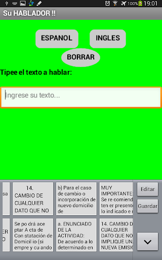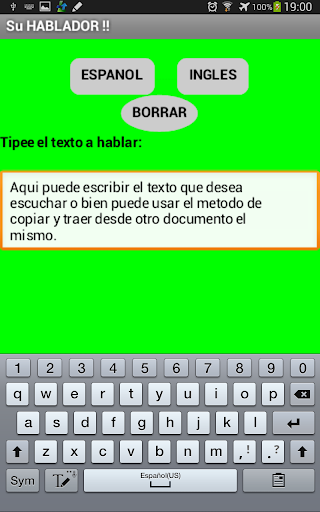 Esta aplicacion permite leerle el texto escrito que ingrese en el casillero destinado a tal fin, sea que lo digito o sea que lo corto y pego. Si el texto esta en castellano presione el boton de "español", si el texto esta en ingles presione el boton en "ingles". Es una manera sensilla de "leer" algo.