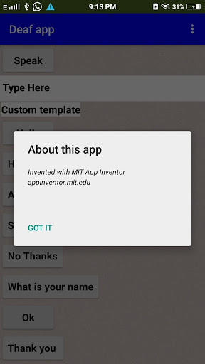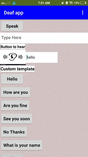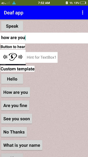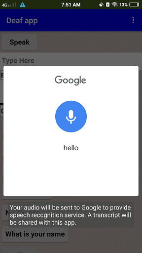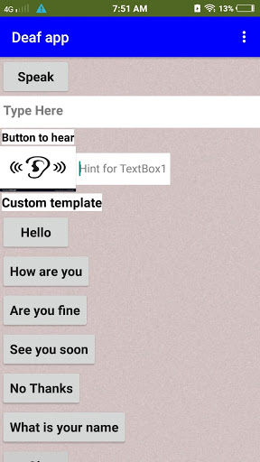This app is made for the people who cannot speak and hear.if the person to speak and hear from others then go to the app there will be a button called "HEAR" . when you click the button you can see the sentence or the word what other people speak .It will appear in a box called"TEXT" on the side of the "HEAR" button . Then you can reply through the box called"TYPE HERE" . Now you can type the word or sentence you want to speak . After you