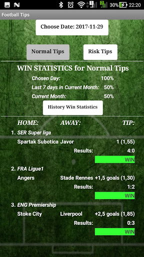 App propose you Best daily football, sport events betting tips. 5 normal and 5 risk football, sport events predictions every day updated you will be have on your phone. You can also use 'user tips' function for searching