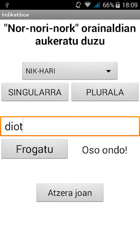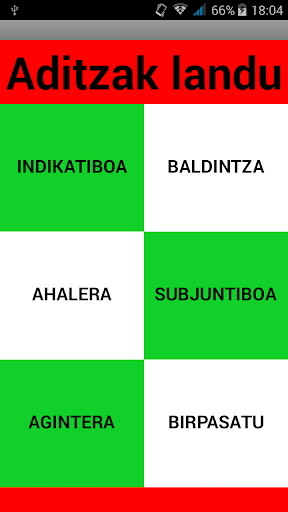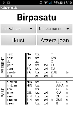 Aplikazio honekin aditzak oso azkar ikas ditzakezu. Saia itzazu indikatiboa, baldintza, ahalera, subjuntiboa eta agintera. Gainera aditzen taula guztia ere birpasa dezakezu, eta hori dena aplikazio honekin!
