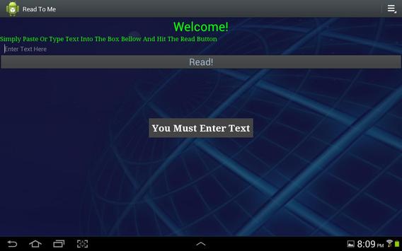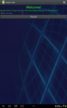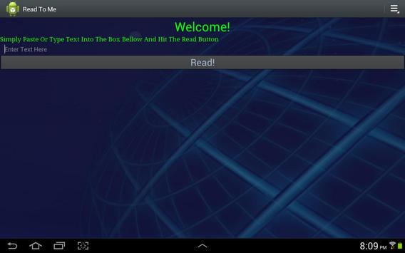 Read To Me is a simple text to speech app. You simply input any amount of text and listen! This app utilizes android built in TTS service so you can change the voice by simply downloading a new one from the market.