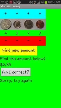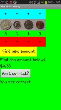 This screen allows the user to add and subtract coins to a specified amount. If you are learning about counting money, then this app is perfect for you. This game is very simple and easy to learn.
