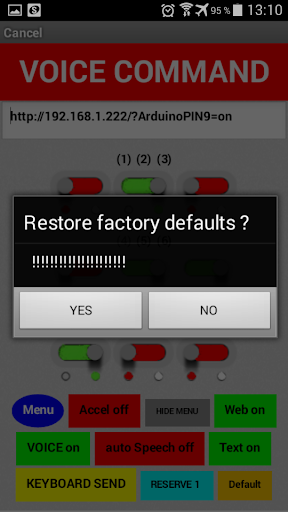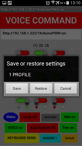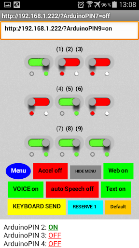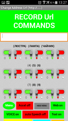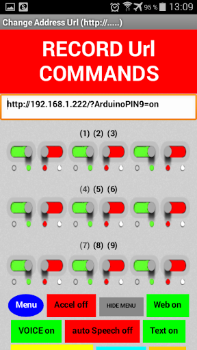 ในการเข้าสู่โหมด "คำสั่ง URL" ค้างไว้ 2 วินาทีปุ่ม "ตั้งค่า" จากนั้นคลิก 2 ครั้งบนปุ่ม "เมนู" ป้อนของคุณ กล่องข้อความ "คำสั่ง URL" ตัวอย่างเช่น "http://192.168.1.222/) reinopin7 = เปิด" และคลิกที่ปุ่ม 16 ปุ่ม (จาก 1 ถึง 16), "URL คำสั่ง" ทั้งหมดจะถูกบันทึกไว้ใน หน่วยความจำไม่ลบเลือนของอุปกรณ์ Android