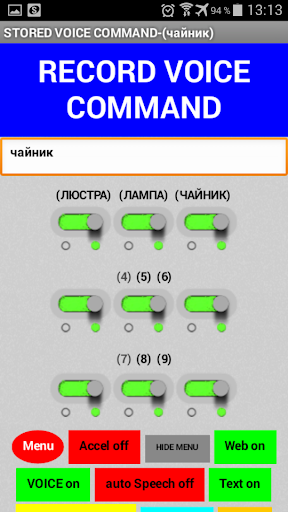 ในการเข้าสู่โหมด "คำสั่งเสียง" กดปุ่ม 2 วินาที "ตั้งค่า" จากนั้นกด 1 ครั้งบนปุ่ม "เมนู" ป้อนปุ่มแป้นพิมพ์ในข้อความ กล่องหรือผ่านการจดจำเสียงปุ่ม "คำสั่งเสียง", "คำสั่งเสียง" ของคุณและคลิกที่ปุ่มใด ๆ ของ 9 ปุ่ม "คำสั่งเสียง" ทั้งหมดจะถูกบันทึกไว้ในหน่วยความจำที่ไม่ได้เปล่งเสียงของอุปกรณ์ Android