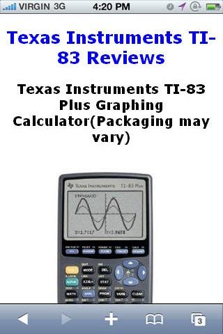 Reviews - Texas Instruments TI-83 Plus Graphing calculator Packaging may vary)Product reviews and customer ratings for Texas Instruments TI-83 . Read and compare experiences customers have had with Texas Graphing Calculator.The TI-83 Plus has a pragmatic key layout and an easy-to-use graphing interface, with a simple programming language for creating conversion programs The TI-83 Plus stores and analyzes up to 10 matrices combined with data storage in lists containing up to 999 elements per list. You can also solve equations interactively for different variables. With the TI-83 Plus, you can view an equation, its graph, and the coordinates all at one time. Jump from point to point by entering a number. Several useful plot types are available, including scatter, box-and-whisker, XY-line, histogram, and normal probability plots. Advanced statistics and regression analysis, graphical analysis, and data analysis are readily accessed, along with features for calculus, engineering financial, logarithm, trigonometry, and hyperbolic functions--all crucial tools for advanced analysis. With its clear display and fast processing, the TI-83 Plus incorporates graphing tools for mathematics and science course work, including statistics and finance. Incredibly useful for college boards--PSAT/NMSQT, SAT I, SAT II, Math, IC, and IIC--the TI-83 is essential equipment for advanced placement courses in chemistry physics, and calculus.
