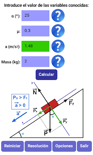 om het probleem volledig te begrijpen, afgezien van de numerieke oplossing, wordt aangeboden op het scherm met gedetailleerde resolutie, intermediaire berekeningen en vectorvertegenwoordiging van alle krachten die bij het probleem zijn betrokken.