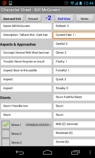 The text boxes have to be small to try to fit an entire character sheet into a phone screen size so a notes page is provided for each character sheet for recording extra detail about Description, High Concept, Stunts etc. This has buttons for adding stunt template text.