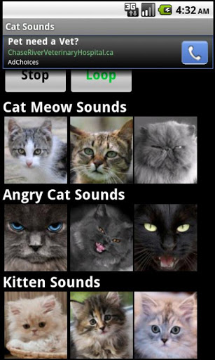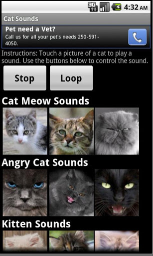 Cat sound effects 15 sounds with loop.Want to have fun with your cat or dog? play these awesome cat sounds for them and watch them go wild 15 Sound effects to choose from you can play each sound once or set up a loop and hide your phone and watch your pet go crazy trying to find the soundFuture updates will be coming with new sounds. Let us know of any compatibility issues with your phone It should work on all of them though.Note: All cat sounds are REAL. Enjoy them You may receive occasional notification ads as we test different advertising methods. This is to help keep the app free