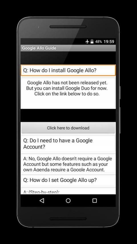 This free Application gives you the possibility to know everything about Google Allo. This is a must have for every Newbie in the Google Allo community. It's not easy to know everything at first, but this App is going to help you out and give you excellent tips! It is a guide, not the actual app. We have provided links for you to directly download Google Allo (download to see if available) from our App!