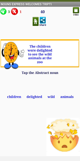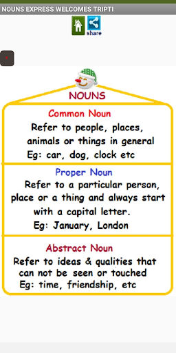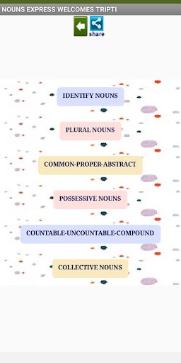 A complete course to master all kinds of nouns like Identify nouns, Singular-Plural noun, Common noun, Proper noun, Abstract noun, Possessive noun, Countable noun, Uncountable noun, Compound noun and Collective noun. It contains many quizzes with over 100 questions in each quiz and themed stickers which is the main attraction. The share button on each page lets you share that page with your friends on social medial because of which you can also share your score.