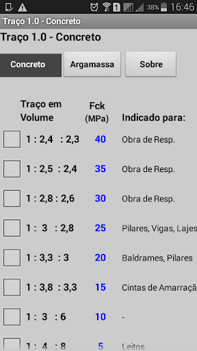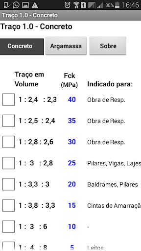 Escolha o Fck desejado e o volume de Concreto, o app te fornece: