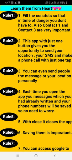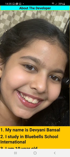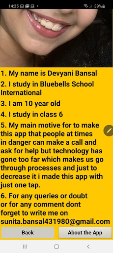 from your contact. You must be thinking this can happen in every phone. But in my app in case of danger you had already set the default message and your contact so open it press the S.O.S. and then message sent , location sent and call made with just one tap . Wow!! Isn’t it amazing! I made this app and my name is Devyani Bansal student of class 6 bluebells school international with the help of my mentor Prateek sir . who helped me in the app .Thank you Prateek sir for standing by me every time and anywhere. Now friends go and