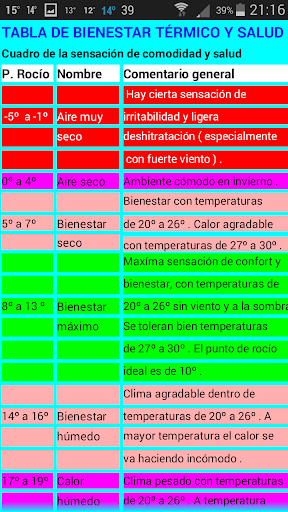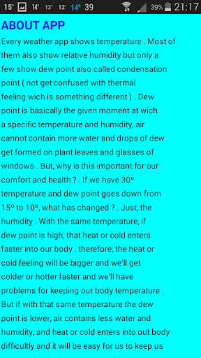 Nhiệt độ động vật, nếu điểm sương cao, điều đó có nghĩa là nhiệt hoặc lạnh được truyền nhanh hơn so với cơ thể chúng ta, với cảm giác của nhiệt hoặc lạnh sẽ lớn hơn và chúng ta sẽ làm nguội hoặc nhiệt nhanh hơn mà chúng ta sẽ gặp vấn đề gì để duy trì nhiệt độ cơ thể của chúng ta. Nhưng nếu có cùng nhiệt độ, điểm sương thấp hơn, không khí chứa ít nước và độ ẩm và nhiệt hoặc lạnh vào cơ thể chúng ta sẽ dễ dàng hơn hoặc tươi. Nhiệt độ thứ 30 vào mùa hè bên bờ biển sẽ cho một điểm sương cao vì độ ẩm của biển để nhiệt sẽ nặng hơn và dính. Nhiệt độ tương tự từ 30 độ xa biển sẽ cho một điểm nhỏ Độ ẩm nhỏ, vì vậy, vì vậy, mặc dù có cùng nhiệt độ, nhiệt sẽ ít áp đảo và dễ chịu hơn. Chúng ta có thể nói về cái lạnh. Điều này cũng phục vụ cho nội thất của những ngôi nhà. Chúng ta có thể mua bằng rất ít tiền một thời tiết nhỏ Trạm có nhiệt kế (nhiệt độ) và ẩm kế (độ ẩm), có thể cho chúng ta biết với ứng dụng này, điểm sương trong phòng khách của chúng tôi, phòng ngủ, v.v. Vì vậy, chúng tôi có thể điều chỉnh hệ thống sưởi hoặc Điều hòa không khí để có được điểm sương tối ưu (từ thứ 8 đến ngày 13) mà không cần phải lạnh vào mùa hè và nhiệt vào mùa đông và lãng phí năng lượng và tiền bạc. Tất cả các ứng dụng khí tượng nên bao gồm bàn và sức khỏe thoải mái. Ứng dụng này là miễn phí , không cần quảng cáo và không cần bất kỳ loại giấy phép nào. Không có điểm nào đã được bao gồm Fahrenheit vì sau đó cần ghi quyền trong bộ nhớ trong hoặc thẻ SD. Trong toàn bộ cửa hàng Play, chỉ có 2 ứng dụng họ tính điểm sương và không Giải thích những gì nó là hoặc những gì nó dành cho. Ứng dụng này lấp đầy một khoảng cách mà không ai chú ý. Tôi không làm điều đó vì tiền.