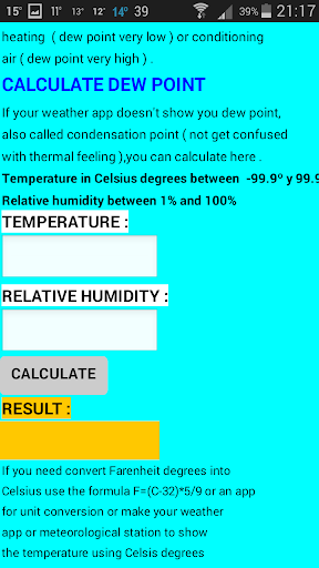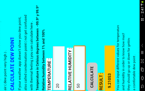 Với ứng dụng này, bạn có thể thấy điểm sương có nghĩa là gì và cách nó ảnh hưởng đến sức khỏe và sức khỏe của chúng ta. Bạn cũng có thể tính toán nó nếu cần thiết.