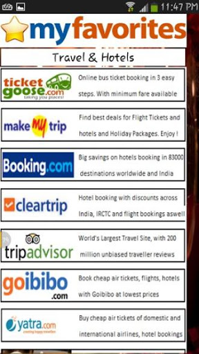 My Favorites App is designed to provide you features of various popular apps in one place. As a consumer you get various options to choose from. You get the best service from reputed websites in this app without downloading individual apps on your mobile. So you have the best of best always.