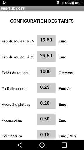 이 응용 프로그램은 3D 프린터로 부품을 판매 할 수있는 을 얼마나 많이 판매 할 수 있는지 알 수있는 간단한 계산기입니다. 응용 프로그램은 PLA 또는 ABS 와이어의 가격을 고려합니다 기계의 전력 소비