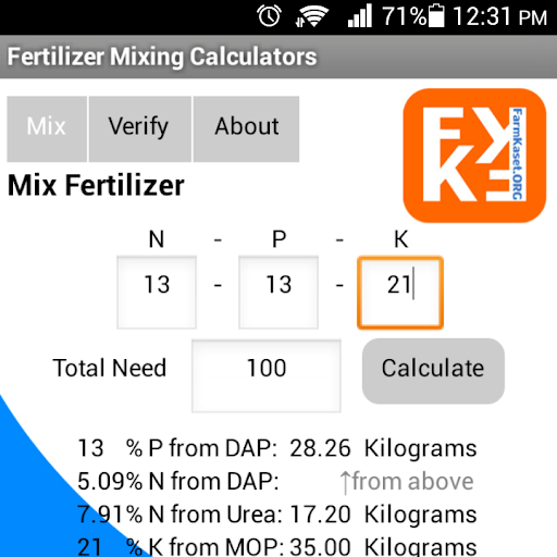 Simple to use, easy to understand. Just fill N-P-K value as you want and click calculate the application will show proportion of Urea, DAP and MOP.