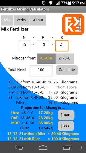 "Verify feature" fill weight of Urea-DAP-MOP and click Verify. The application view calculate and display formula of fertilizer.