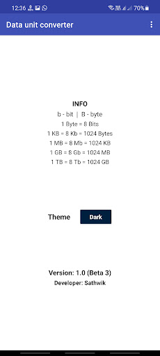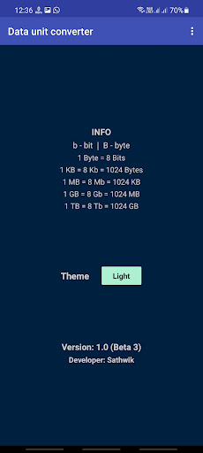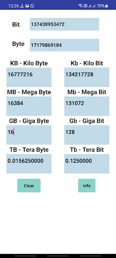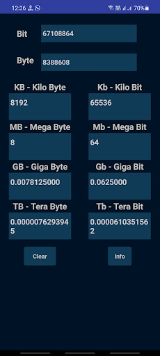 This application does the conversion between data units like Bits, Bytes, KiloBits, KiloBytes, MegaBits, MegaBytes, GigaBits, GigaBytes, TeraBits, TeraBytes.
