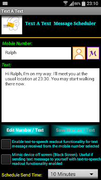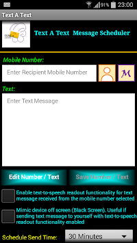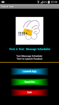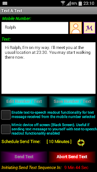 Text A Text allows you to type and schedule a text message to be sent off in predefined time “Immediate”, “1 Minute”, “2 Minutes”, “5 Minutes”, “10 Minutes”, “15 Minutes”, “30 Minutes”or “60 Minutes” to yourself, people in your contact list or any mobile number. Included is a text-to-speech readout functionality that when activated, read out the text message received from the mobile number you selected.