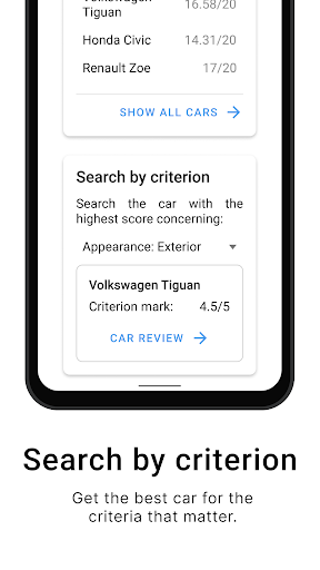 - Search by rating: Select a criterion, and get the one with the highest score for this criterion among the cars you saved.