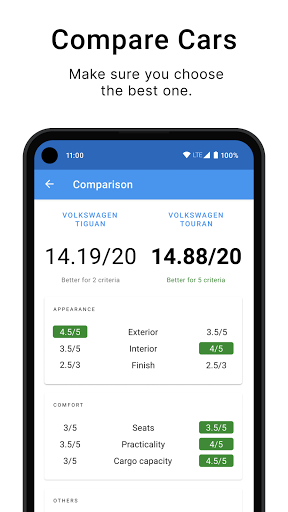 - Compare cars: Select two cars, and compare every criterion.