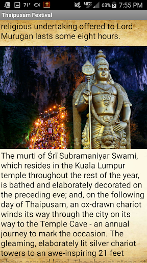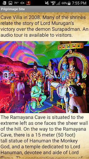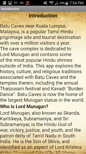 Batu Caves near Kuala Lumpur, Malaysia, is a popular Tamil Hindu pilgrimage site and tourist destination with over a million visitors a year. The cave complex is dedicated to Lord Murugan and contains some of the most popular Hindu shrines outside of India. This app explores the history, culture, and religious traditions associated with Batu Caves and the temples therein, including the annual Thaipusam festival and Kavadi "Burden Dance". Batu Caves is now the home of the largest Murugan statue in the world.