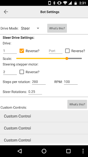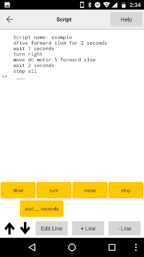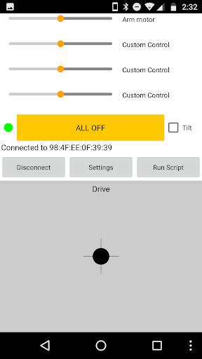 The Ardroid app communicates through Bluetooth Low Energy (BLE) with the robot. It allows driving the robot (with the touchscreen or by tilting the phone) and moving individual DC or stepper motors, with a variety of possible motor arrangements. It also has a simple scripting language to write sequences of actions for the robot to complete. The scripting language is designed to be as simple as possible to use, with no programming experience required.