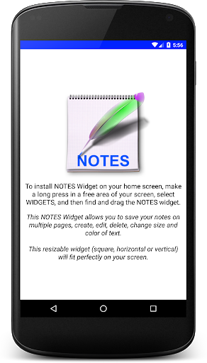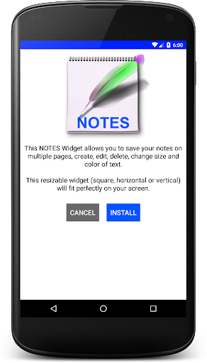 After installing the app, go to the Widgets part of your mobile, look for NOTES, make a long press and place the widget in a free space or on a new homepage, drop the widget, an installation window will open, click install.