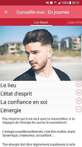 The application offers advice adapted to different situations, such as seduction during the day (seduce a girl on the street, in the subway, in a shop or a shopping center...) but also to seduce in the evening (seduce a girl with friends, in a bar or in a night club...)